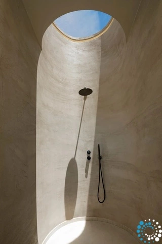 De suite ligt hoog boven het eiland en biedt weidse uitzichten over Santorini’s ongerepte westkant. De privé-ingang met hoge muren zorgt voor afzondering, en van een afstand gaat de suite naadloos op in het ruige landschap. Vage echo’s van stemmen en autoclaxons die omhoog dragen, herinneren u eraan dat de gebruikelijke drukte van Santorini beneden doorgaat, maar hier boven is de rust onmiskenbaar.