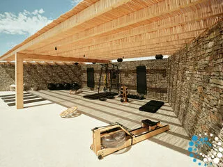 Een terras met een adembenemend uitzicht over de Egeïsche Zee is ideaal voor dineren in de open lucht, terwijl de afgelegen binnenplaats de ultieme schuilplaats biedt waar u overdag kunt ontspannen in het comfort van uw privéplungepool, ligbedden en buitensalon, terwijl het bamboegeluide pergola het Egeïsche zonlicht zacht filtert.