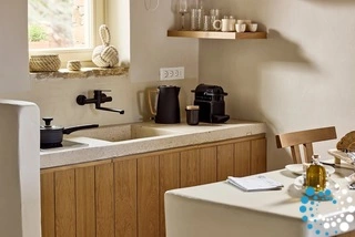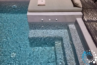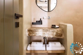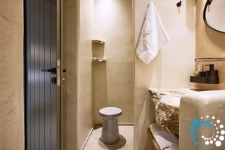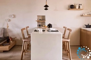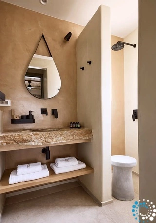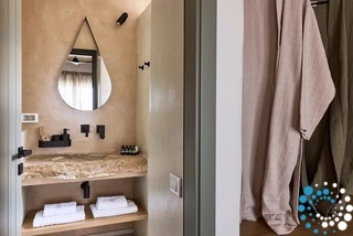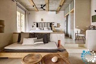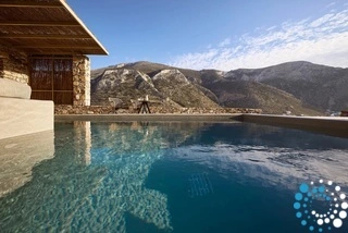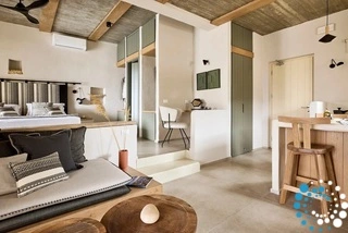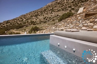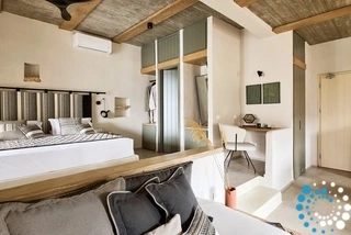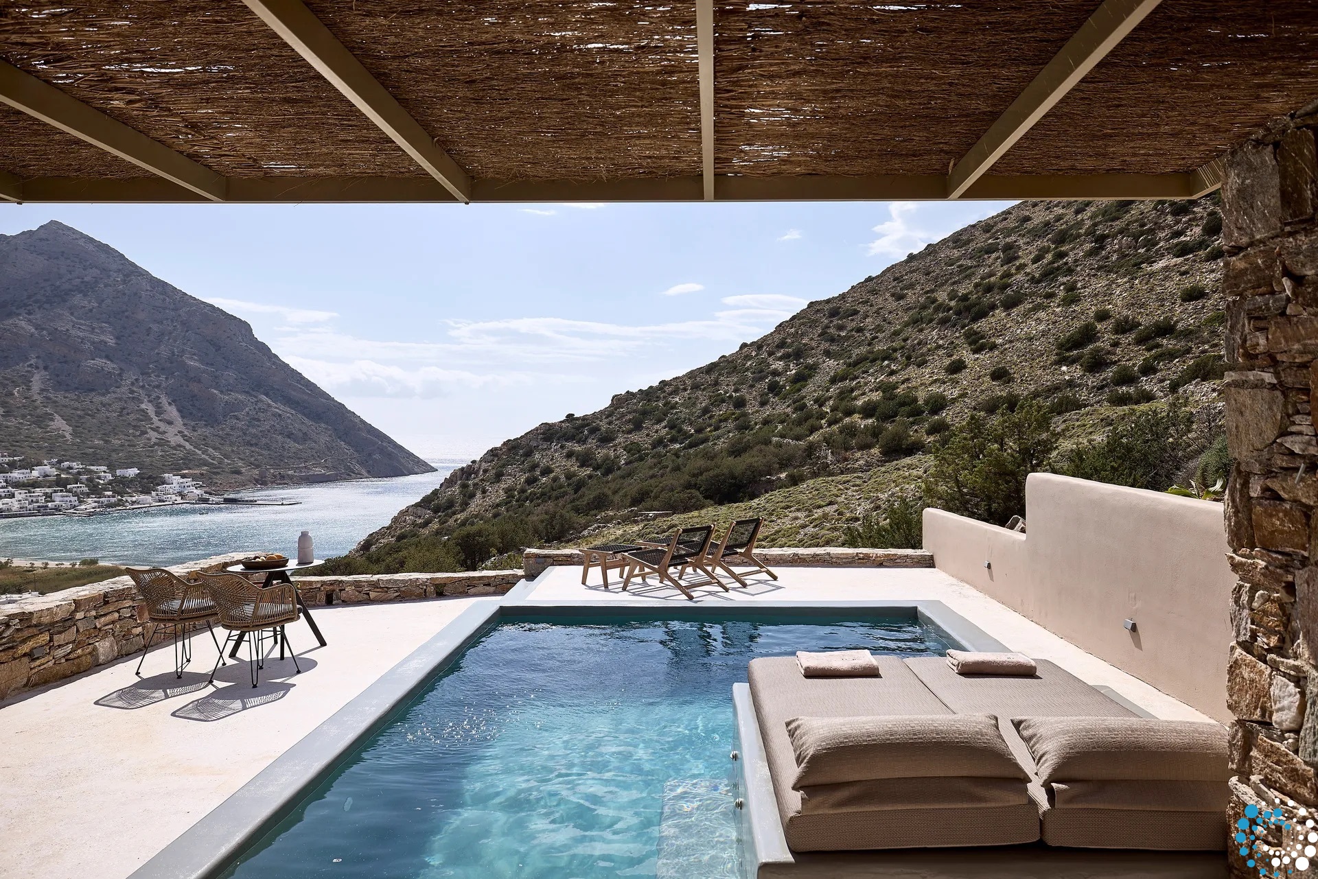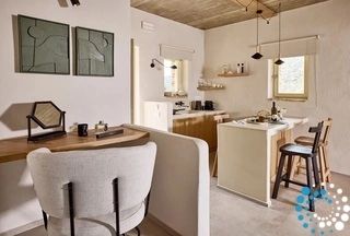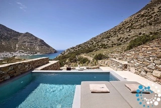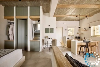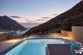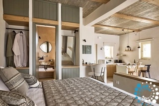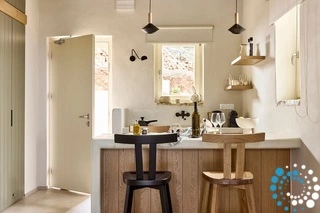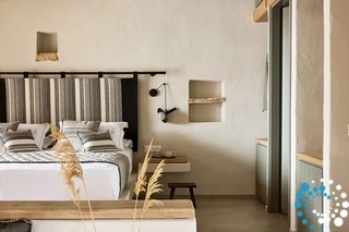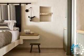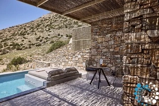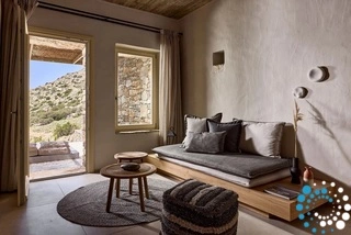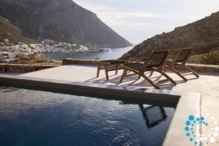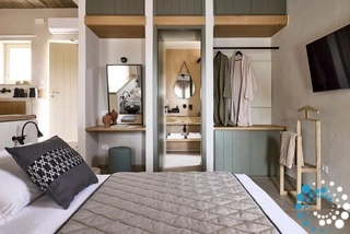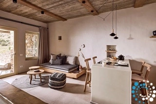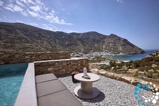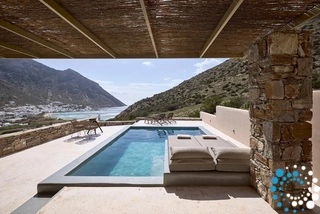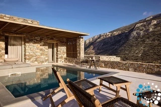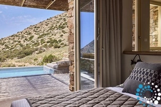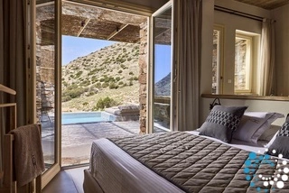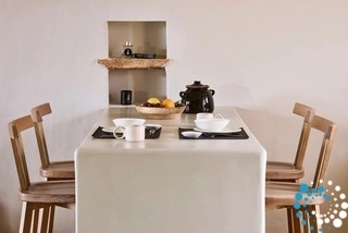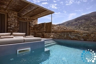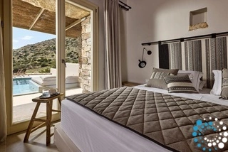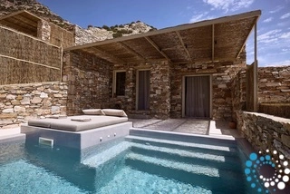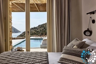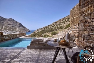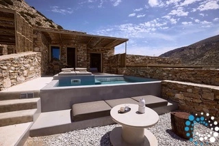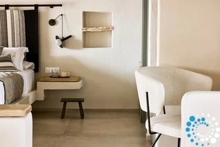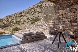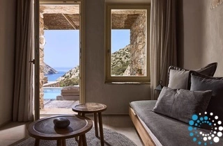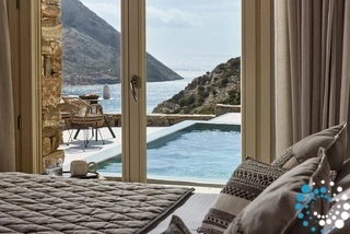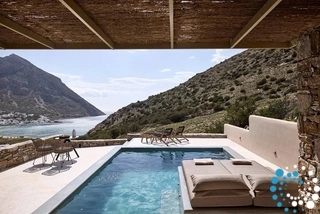 Uitzicht op het zandstrand en de diepblauwe Egeïsche Zee geeft een gevoel van lichamelijke en mentale verkwikking. Deze combinatie biedt een unieke ervaring van volledige zelfvoorziening en verbinding met de natuur. Suite Kreestal bestaat uit een open slaapkamer met woonkamer, een gedeeltelijk uitgeruste keuken en een privéterras met zwembad, ligstoelen en zithoeken.