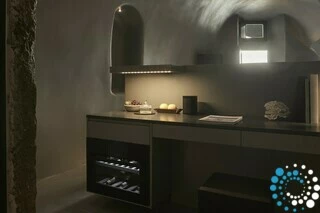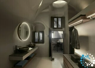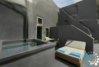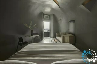 Deze suite maakt deel uit van een vijfsterrenhotel in Imerovigli, het meest afgelegen en serene gedeelte van Santorini. Hoewel het eiland bijna het hele jaar door bezoekers trekt, blijft Imerovigli rustig en intiem, met slechts een paar boetiekhotels en enkele verfijnde restaurants die stil opgaan in de vredige omgeving. In tegenstelling tot veel accommodaties langs de kliffen is dit hotel gemakkelijk bereikbaar: u rijdt rechtstreeks naar uw privéparkeerplaats bij de hoofdingang en hoeft slechts een korte wandeling van ongeveer twintig treden naar beneden te maken naar het tweede niveau.