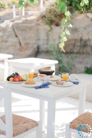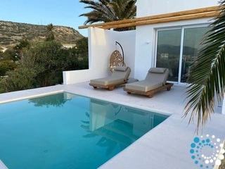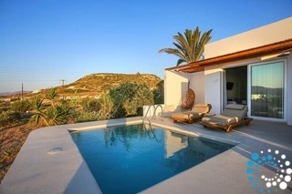Dompel uzelf onder in de betoverende omgeving: wandel tussen geurige bloemen, ontspan onder de palmbomen en geniet van panoramisch uitzicht op het schilderachtige vissersdorp Pollonia en de omliggende eilanden. Met de Egeïsche Zee als achtergrond wordt elk moment een herinnering om te koesteren.