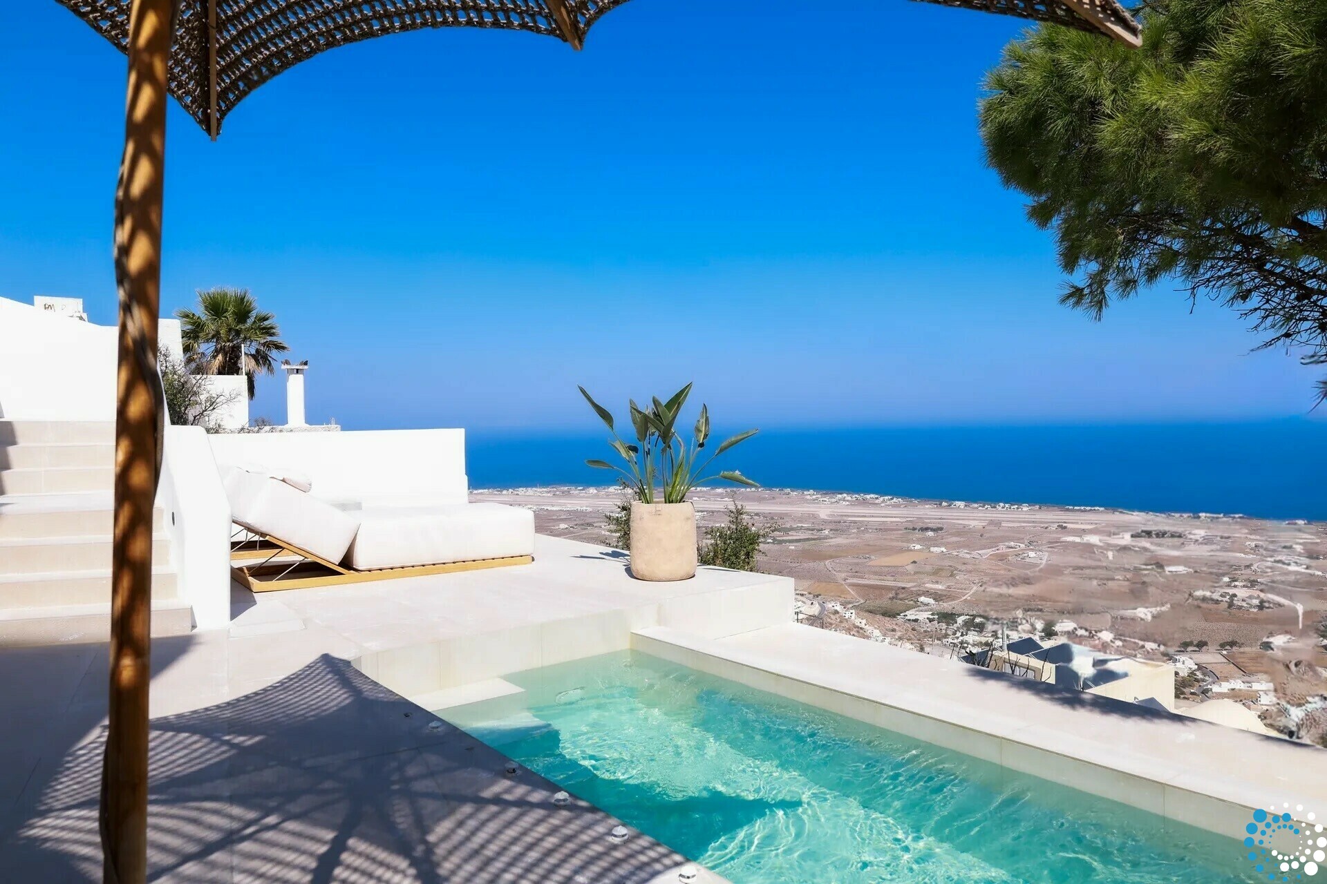Buiten nodigt een privé verwarmd dompelbad je uit om tot rust te komen terwijl je geniet van het zonovergoten landschap en panoramische uitzichten op het eiland, een ideale setting voor stille momenten van zonsopgang tot zonsondergang.
