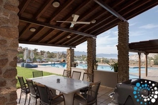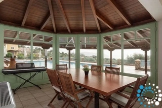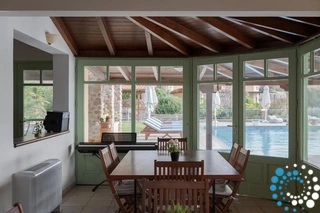 Stap naar buiten naar het adembenemende zwembadgebied, waar een 14 m x 7 m groot zwembad met jacuzzi en een kindvriendelijk gedeelte uitnodigt voor een verfrissende duik. Het aangrenzende Pool House is ideaal voor entertainment en beschikt over een grote buitentafel, een ruime zit- en eethoek binnen, een volledig uitgeruste keuken, een open haard en een toilet. Voor liefhebbers van koken in de buitenlucht is er een speciale BBQ-ruimte gereed voor gebruik.