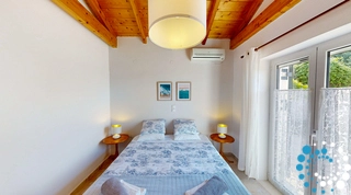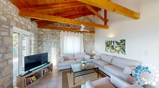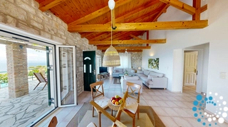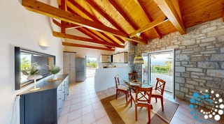 Inside and outside the villa local limestone prevails and this is combined, in the interior, with wood and simple Mediterranean décor, creating a pleasant and relaxing atmosphere.The open-plan living room, dining room and kitchen, and two separate bedrooms (each with its own en-suite bathroom), spread out on the ground floor, with three exits to the garden and pool.All rooms have large patio doors or windows that allow natural light and unobstructed views.A wooden pergola extends along the front of the house casting welcome shade on the terrace and the outdoor dining area.