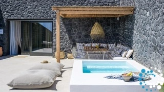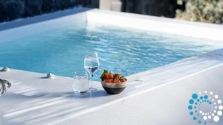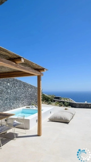 Het royale buitengedeelte is voorzien van een ingebouwde eethoek en een verwarmde jacuzzi waar u in alle privacy kunt genieten van romantische momenten met uitzicht op de indigo blauwe Egeïsche Zee.