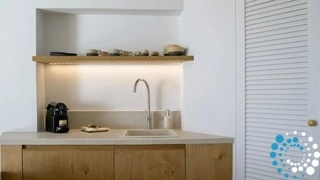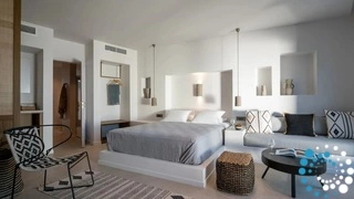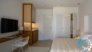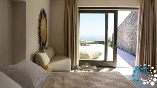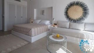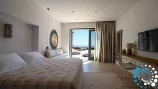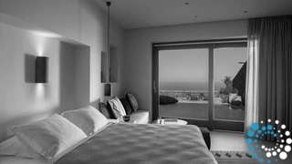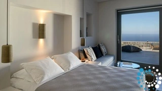 Ontspan in een omgeving die rust en sereniteit uitstraalt, kom tot rust op uw kingsize bed of gezellige bank terwijl u geniet van het wonderlijke uitzicht op het eindeloze azuurblauw van de zee, en maak gebruik van de hoogwaardige voorzieningen die comfort en luxe aan uw verblijf toevoegen. De ruime badkamer is uitgerust met een regendouche voor echte momenten van ontspanning. De schuifdeuren van vloer tot plafond openen naar uw privéterras, waardoor het een verlengstuk van uw binnenruimte lijkt.