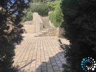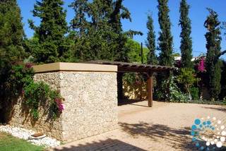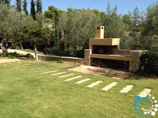 De tuin is opgebouwd in verschillende niveaus, afgewerkt met lokale natuursteen, en biedt drie terrassen met prachtig uitzicht op zee en op het eiland Spetses. Alle terrassen komen uit op het grote zwembad. Er is een tafeltennistafel en een speelruimte beschikbaar voor kinderen en volwassenen.