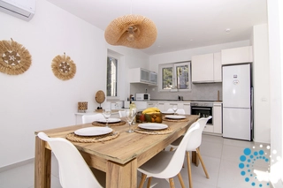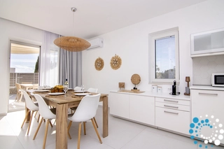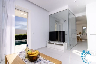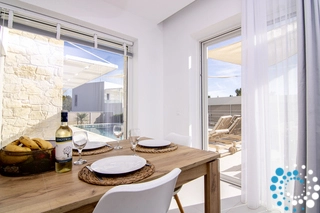 Alle ramen zijn naar het zuiden gericht en de hoofdingang ligt op het noorden. Op de begane grond bevindt zich de volledig uitgeruste keuken, verbonden met de grote eetkamer met directe toegang naar buiten. De woonkamer is voorzien van een smart-tv en een slaapbank, en daarnaast is er een regendouche, die direct naar het zwembad leidt.