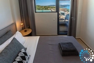 Buiten bevindt zich een houten terras van 18 m² met een zwembad (4,2 m x 2,6 m) en een moderne, gezellige eettafel om van je maaltijden te genieten. Vanaf het hele terrein heb je een prachtig uitzicht op zee.