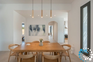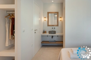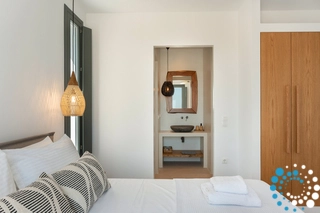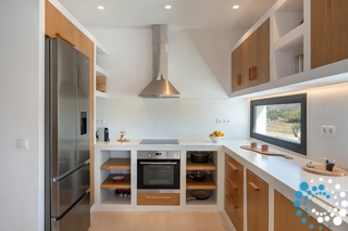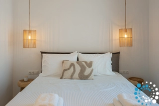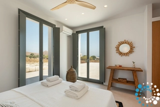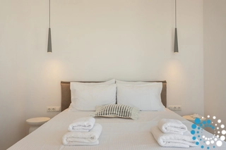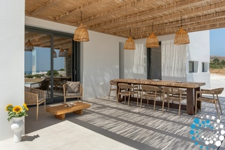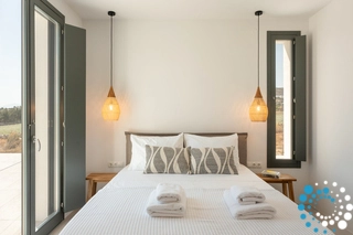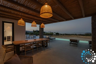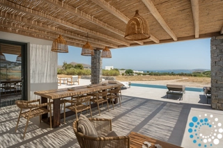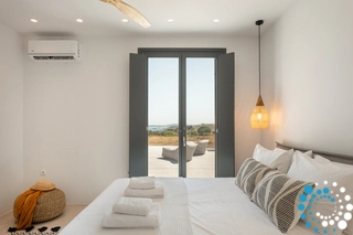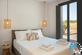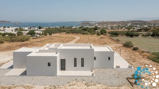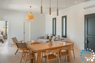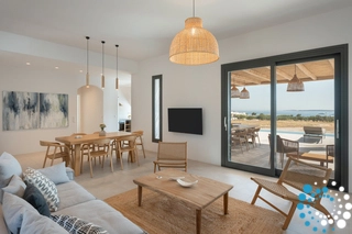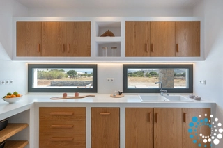 De ruime woonkamer nodigt uit tot ontspanning, terwijl de volledig uitgeruste keuken alles biedt wat je nodig hebt om zelfgemaakte maaltijden te bereiden voor familie en vrienden. Grote ramen zorgen voor veel natuurlijk licht in het interieur en verbinden binnen en buiten naadloos met het prachtige landschap van Paros.