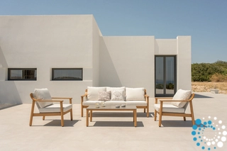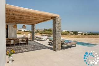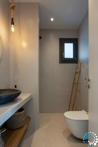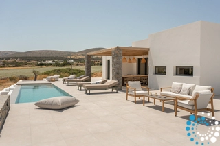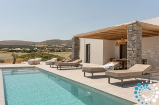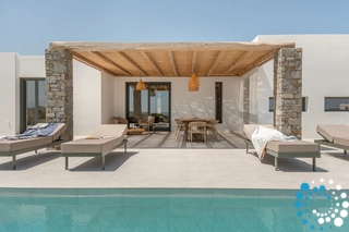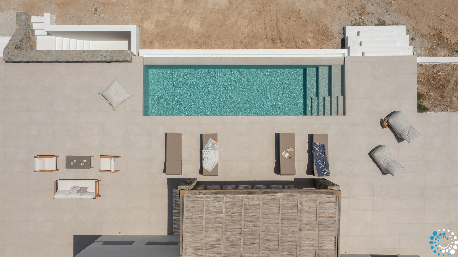 Stap naar buiten en ontdek het privé buitengebied van de villa, ideaal voor een diner in de buitenlucht of om te ontspannen onder de Egeïsche zon. In het hart van het exterieur ligt een verfrissend zwembad, omringd door comfortabele zitplaatsen en een rustige ambiance — je eigen privé-oase.