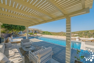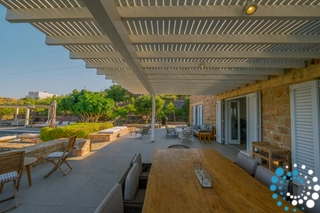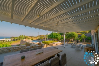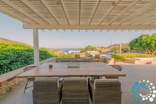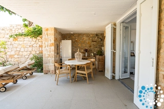 Op de ruime veranda is er een romantische, overdekte eethoek met een teakhouten tafel voor 10 personen, met uitzicht op het zwembad en de zee. Hier verwelkomt men familie en vrienden voor een mediterraan ontbijt, ijskoude cocktails en heerlijke diners.