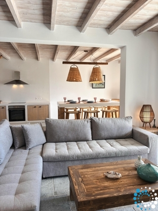 Op de begane grond opent de villa naar een lichte, volledig uitgeruste keuken met een centraal eiland, ideaal voor ontspannen ontbijtjes en gezamenlijke maaltijden. De ruime woonkamer, ingericht met comfortabele zitplaatsen en een tv, nodigt uit tot ongedwongen momenten van comfort, terwijl een stijlvolle gastentoilet extra gemak biedt.