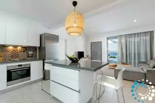 De keuken is volledig uitgerust met moderne apparatuur en grote terrasdeuren die de villa vullen met natuurlijk licht. Naast de keuken bevindt zich de ruime, elegant ontworpen woonkamer, waar u kunt ontspannen en genieten van het uitzicht op het terras en het zwembad, of ’s avonds tot rust kunt komen op de comfortabele bank terwijl u een film kijkt op de 40'' satelliet-tv.