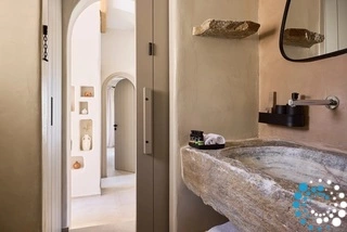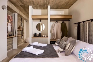 Op de benedenverdieping vindt u een open slaapkamer met een kleine zithoek, ontworpen als een kleine verborgen grot met een prachtig uitzicht op de bergen en de zee. Het industriële plafond en de muren, samen met het houten meubilair, zorgen voor een volledig harmonieus resultaat.