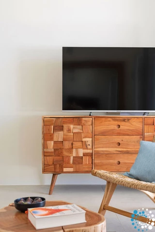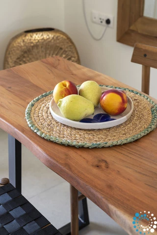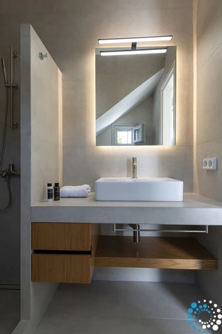 De volledig uitgeruste keuken is afgewerkt met kwaliteitsmaterialen en heeft een praktische indeling. Twee badkamers vervolledigen het interieur, dat verrijkt is met natuurlijke materialen en warme houttinten – een verfijnde maar uitnodigende sfeer die harmonieus aansluit bij het omliggende landschap.