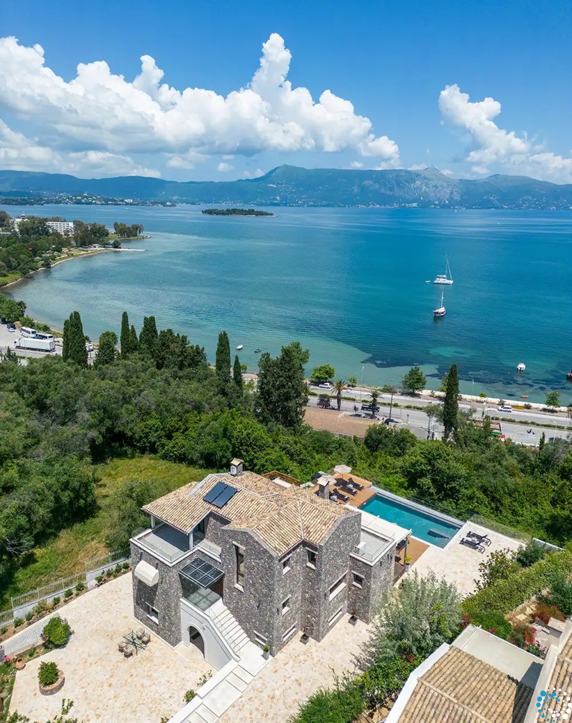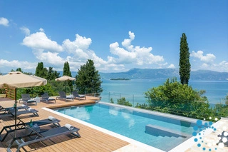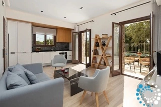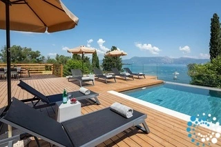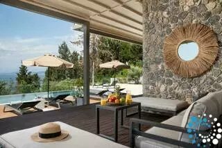 Het terras, ingericht met stijlvolle en comfortabele zitplaatsen, is de perfecte plek voor avonden met cocktails, kaarslicht en vrienden. Het aangrenzende eetgedeelte is ideaal om te genieten van maaltijden geïnspireerd door de lokale smaken van Corfu, aangevuld met de geuren van de verzorgde kruidentuin in de buurt.