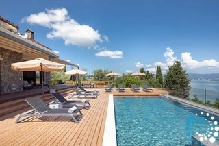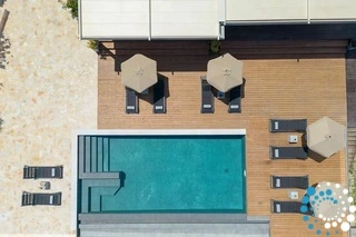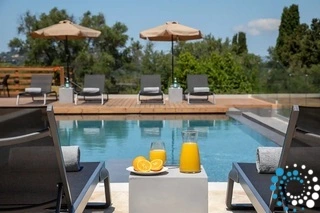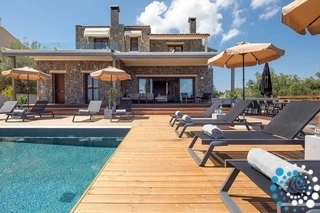Het hoogtepunt van de buitenruimte is het 40 vierkante meter grote zwembad, dat op verzoek verwarmd kan worden, zodat gasten het hele jaar door kunnen zwemmen. Of het nu gaat om sporten met het tegenstroomsysteem of ontspannen in het spa-gedeelte, het zwembad biedt zowel ontspanning als welzijn. Daaromheen zorgen luxe ligstoelen en schaduwrijke plekken voor de ultieme setting voor ontspanning, terwijl de omliggende tuinen met olijfbomen en magnolia’s de schoonheid van de Griekse flora laten zien.