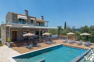 De hoofdingang van Villa Melania opent naar een eigentijdse woonkamer met een gezellige open haard en een elegante eethoek. Entertainment is moeiteloos met een grote plasma-tv, compleet met Netflix en satellietkanalen. Door het grote raam kunt u het zwembad, de glooiende groene heuvels, de glinsterende zee en, in de verte, de bergen van Noord-Corfu bewonderen.