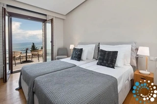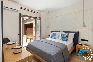 Een lichte gang met een moderne houten trap leidt naar de bovenverdieping, waar nog twee slaapkamers wachten. Beide kamers hebben een eigen badkamer en een panoramisch uitzicht op het steeds veranderende landschap van Corfu. Tussen de slaapkamers is een klein kantoorruimteje gecreëerd voor gasten die een rustige werkplek nodig hebben.
