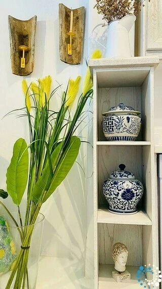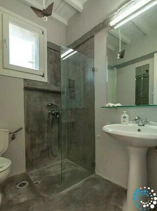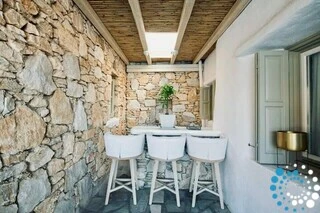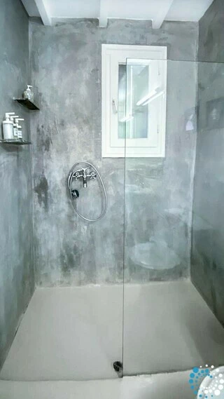 Microcement bedekt de volledige vloer van het gebouw en wordt gecombineerd met het traditionele Mykonische houten dak en Cycladische architectonische elementen zoals ingebouwde structuren en bogen. Dit creëert een indrukwekkende sfeer die perfect samengaat met originele kunstwerken en designmeubels.