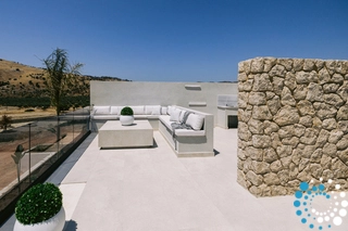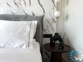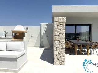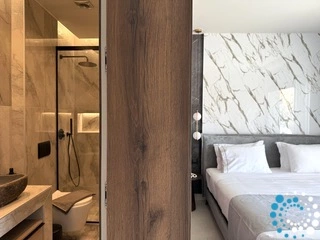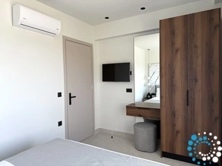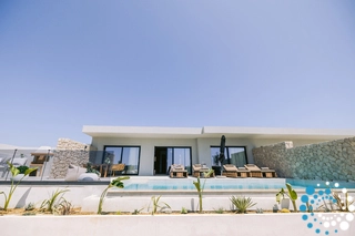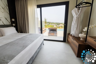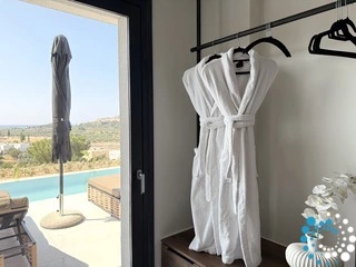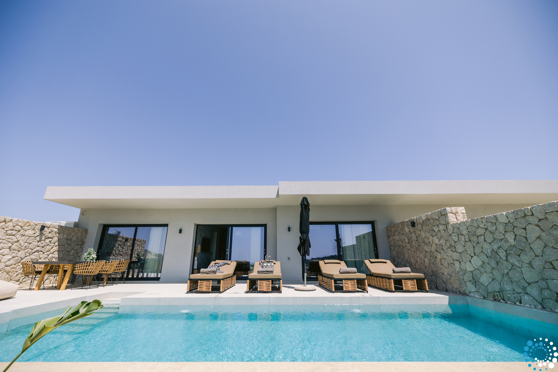 Buiten komt de ware luxe tot leven. Een privézwembad met comfortabele ligbedden en parasols nodigt gasten uit om te genieten van de Griekse zon. Een stijlvolle eethoek buiten met zes zitplaatsen en een ruime lounge creëren de ideale setting voor maaltijden in de buitenlucht of een avondcocktail. De villa’s bieden adembenemende uitzichten over de horizon, terwijl de weelderig aangelegde tuin bijdraagt aan rust en privacy. Gratis privéparkeergelegenheid is beschikbaar op het terrein.