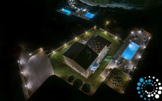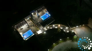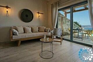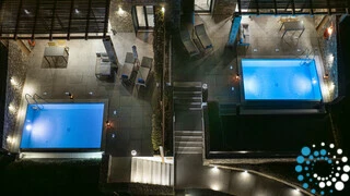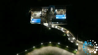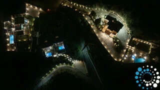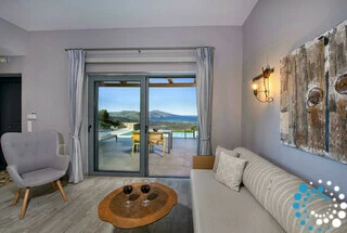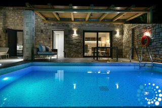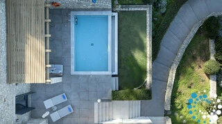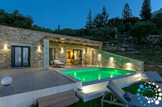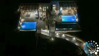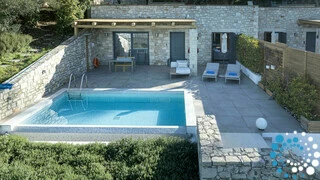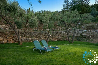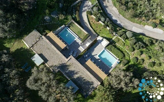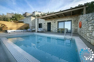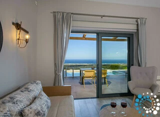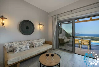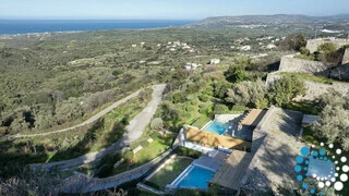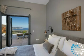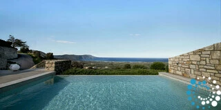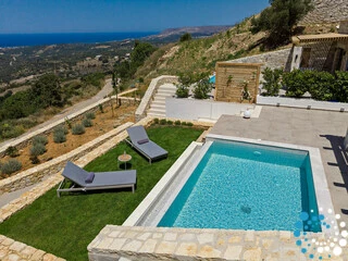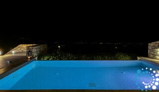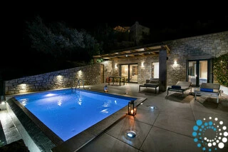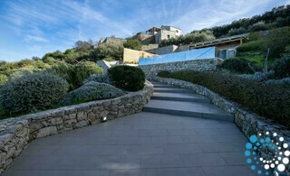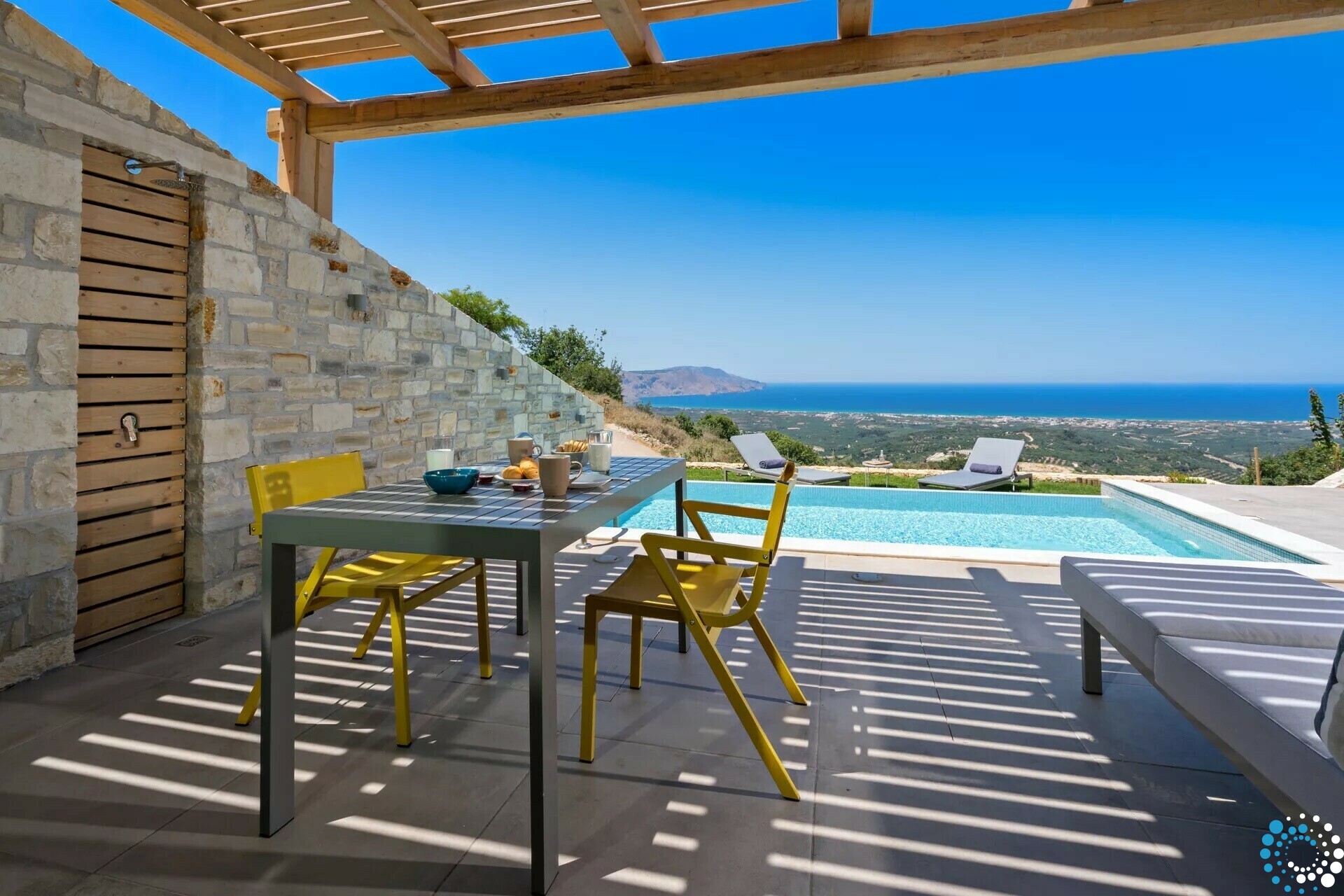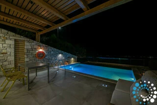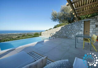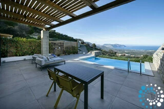 Buiten bevindt zich een schaduwrijk terras onder een pergola, dat uitkomt op een privézwembad dat ’s avonds zacht verlicht wordt. Ligbedden zijn strategisch geplaatst om optimaal te genieten van het weidse uitzicht op zee, waar de horizon zich uitstrekt in eindeloze blauwtinten. In deze rustige heuvelomgeving combineert de villa luxe met natuurlijke schoonheid en biedt zij een afgelegen verblijf gekenmerkt door licht, privacy en ingetogen elegantie.