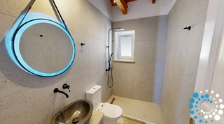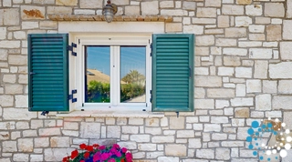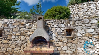 Zowel binnen als buiten overheerst lokale kalksteen, gecombineerd met hout en een eenvoudige mediterrane inrichting, wat een aangename en ontspannende sfeer creëert.