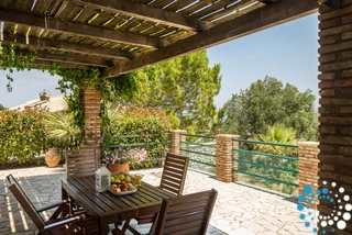 Alle kamers beschikken over grote openslaande deuren of ramen die natuurlijk licht binnenlaten en vrij uitzicht bieden. Een houten pergola strekt zich uit langs de voorzijde van het huis en biedt welkome schaduw op het terras en de buiten-eetruimte.