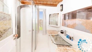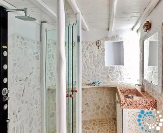 Alle badkamers zijn fraai vormgegeven met natuursteen, de elementen van de zee en luxe ornamenten. Ze beschikken over douchecabines met gekleurde, glazen deuren.