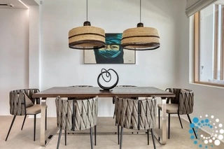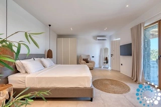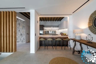 De ruime woonruimtes stralen een warme sfeer uit met stijlvolle meubels en doordachte details, en vormen een perfecte balans tussen elegantie en ontspanning. Grote glazen deuren openen naar het terras en laten veel natuurlijk licht binnen, terwijl ze prachtige zeezichten omlijsten. De villa beschikt ook over een volledig uitgeruste keuken voor kookliefhebbers. Met moderne apparatuur en veel werkruimte is deze ideaal voor het bereiden van zowel snelle ontbijten als uitgebreide diners.