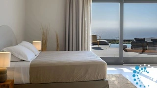 Villa Skiron beschikt over een kingsize bed, een volledig uitgeruste badkamer met douche en opent naar een privéterras met zwembad, waar je kunt zwemmen en ontspannen op de comfortabele ligbedden of de bank.
