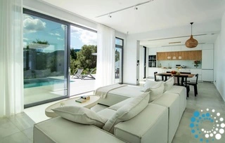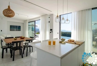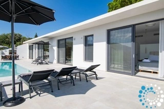 Binnen beschikt de villa over een privé-ingang en volledig airconditioned interieur. De moderne keuken is volledig uitgerust met een kookplaat, koelkast, vaatwasser en alle essentiële kookgerei, zodat u op uw eigen tempo uw favoriete maaltijden kunt bereiden. Twee comfortabele slaapkamers zorgen voor een goede nachtrust, terwijl de twee elegant ontworpen badkamers voorzien zijn van inloopdouches en föhns voor uw gemak.