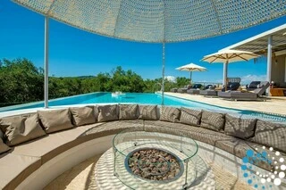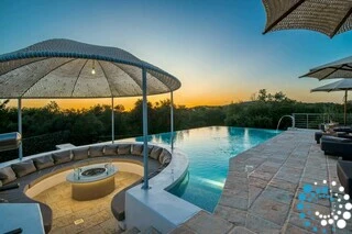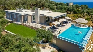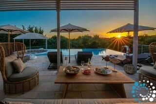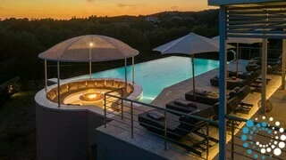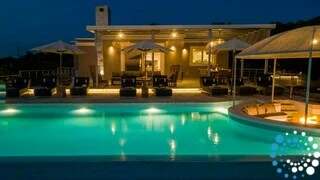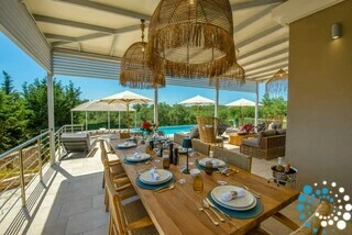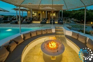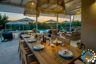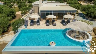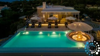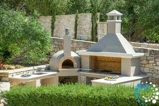 De buitenruimtes definiëren luxe leven in deze accommodatie op de Ionische Eilanden, met een spectaculair infinity pool waar het kristalheldere water lijkt samen te smelten met de horizon van de Ionische Zee. De unieke cirkelvormige vuurplaats-lounge, omringd door comfortabele zitkussens, biedt een intieme setting voor avondbijeenkomsten. Meerdere overdekte terrassen bieden diverse ruimtes om te dineren, te loungen en te entertainen, terwijl de volledig uitgeruste buitenkeuken een traditionele stenen pizzaoven en moderne BBQ-faciliteiten bevat.