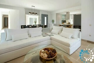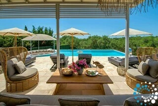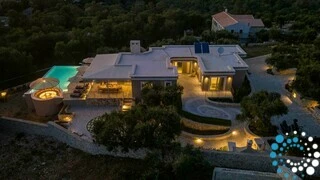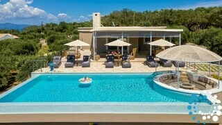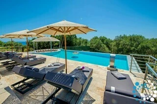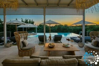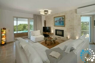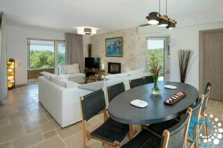 Betreed een wereld van verfijnde luxe in Villa Vasilema, waar eigentijds minimalisme samenkomt met traditionele Paxiot-architectuur in deze uitzonderlijke villa. De stijlvolle open woonkamer beschikt over een onberispelijke witte hoekbank, design hanglampen en een indrukwekkende schoorsteenwand met steenbekleding die als opvallend middelpunt dient. Vloer-tot-plafond ramen omlijsten een adembenemend zeezicht en vullen de ruimte met natuurlijk mediterraan licht.