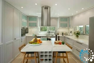 De ultramoderne keuken van deze Griekse eilandaccommodatie beschikt over strakke witte kasten met matglazen details, aanrechtbladen met marmerlook en hoogwaardige apparatuur, waaronder dubbele ingebouwde ovens, een inductiekookplaat, een Nespresso-apparaat en een koelkast met vriesvak. De aangrenzende eetkamer biedt plaats aan acht gasten rond een elegante eettafel van donker hout, verlicht door opvallende hanglampen van wicker.