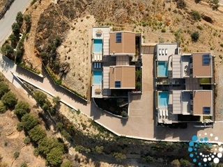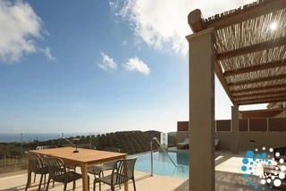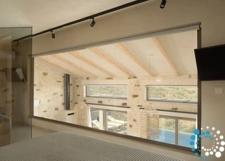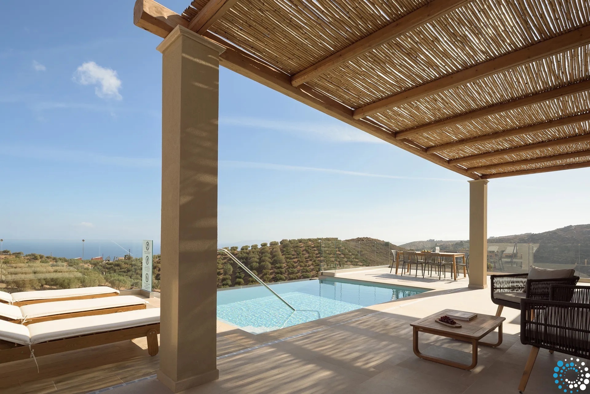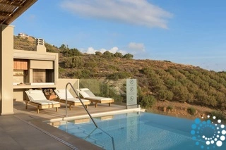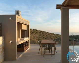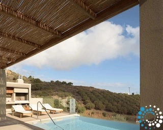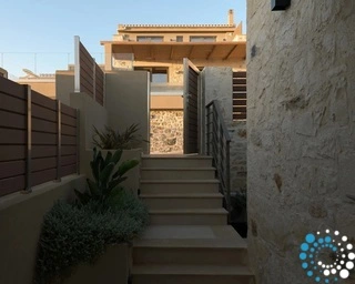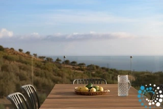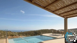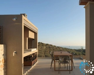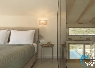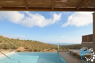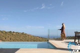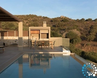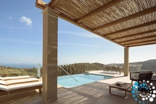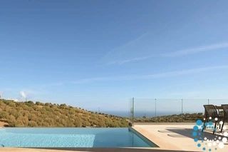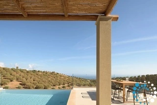 Ontspan bij uw privézwembad, waar adembenemende uitzichten op zowel de zee als de bergen samenkomen met de rust van de natuur. De villa, vervaardigd uit steen en hoogwaardige materialen in rustgevende natuurlijke tinten, straalt warmte uit en sluit naadloos aan bij de omgeving, terwijl de zachte geuren van buiten de lucht vullen.