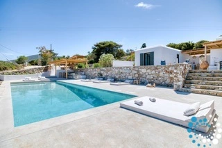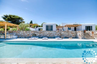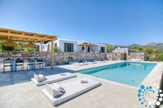 De architectuur doet denken aan perfecte witte suikerklontjes en creëert uitnodigende binnenruimtes en talloze rustige hoekjes om te ontspannen. Een imposante pijnboom vormt het middelpunt van het bovenste buitengedeelte en zorgt voor natuurlijke schaduw. Enkele treden lager ligt het ruime zwembad- en BBQ-gedeelte, met zowel zon- als schaduwplekken—ideaal voor lange diners, ontspannen momenten of het bewonderen van het uitzicht over de zuidelijke Egeïsche Zee.