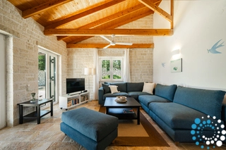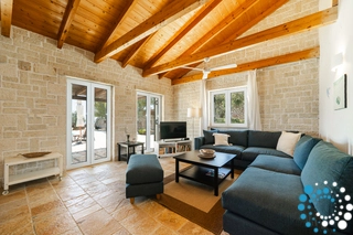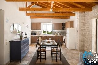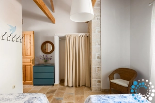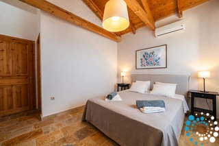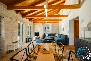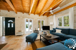 Zowel binnen als buiten domineert lokale kalksteen, gecombineerd met hout en een eenvoudige mediterrane inrichting, wat een aangename en ontspannende sfeer creëert.