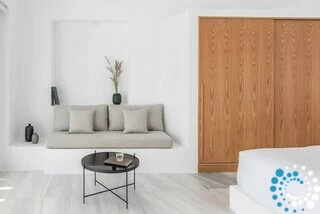 This is more than a hotel; it is a journey into serenity. Minimalistic at its core yet eclectic in style, it exudes sensuality and comfort. With only three exquisitely designed suites, each featuring a private pool, it feels like a home away from home—naturally sheltered from the winds and the lively energy of Fira, the island’s vibrant capital.