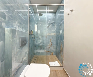 The apartment features two comfortable bedrooms, each with its own ensuite bathroom with shower, one with a fixed double bed and one that can be set up as a double or two twins. It includes Cocomat sleep systems for optimal rest, a fully equipped modern kitchen with Bosch, Miele, and Liebherr appliances including a combo microwave oven, induction hobs with built-in extractor, dishwasher, washing and dryer machine. There is smart air conditioning in every room, a Frame TV, and soft ambient lighting. Toiletries, blow dryers, an iron and ironing board, and a hoover stick are also provided. A private water tank ensures full comfort even during Corfu’s occasional town-wide water shortages.