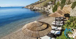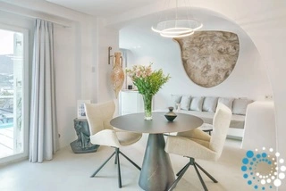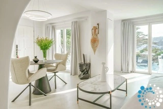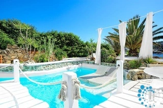 This villa belongs to a 5-star Hotel. An architectural oasis, this beachfront resort treats its guests to a plethora of premium services and amenities. Its world-class facilities include impressively decorated and luxuriously appointed rooms and suites, an incredible villa with a private pool and a secluded beach area, two swimming pools with open-air Jacuzzis, a SPA, a state-of-the-art fitness center, a private beach, restaurants and bars, an art gallery, a boutique, a hair salon, a scenic chapel within its premises, and a private yacht anchored in Ornos bay.