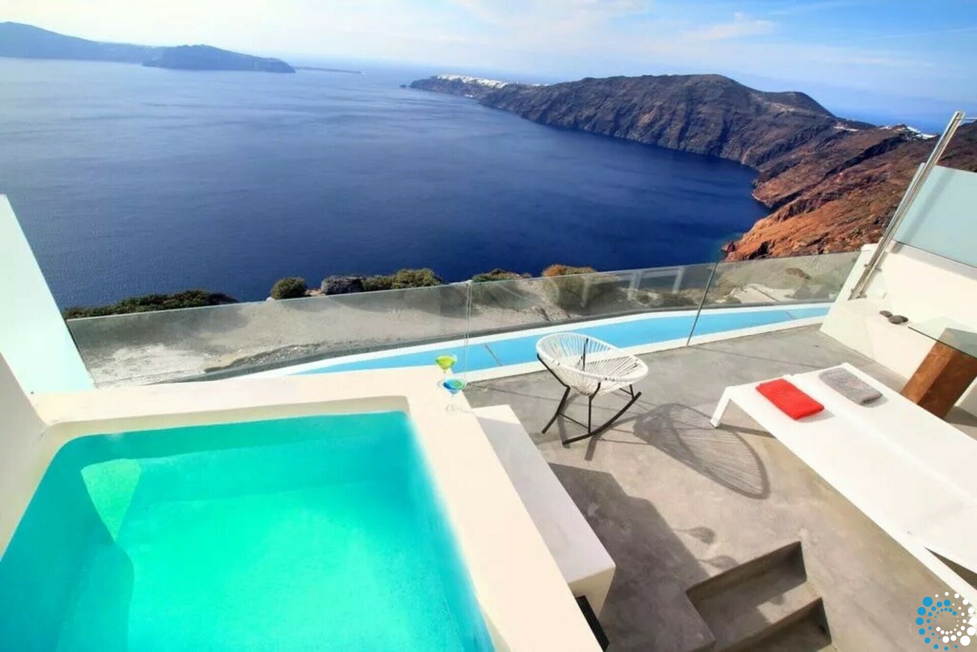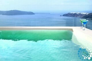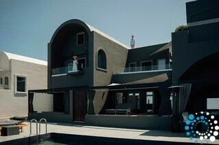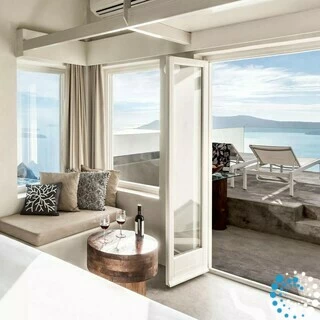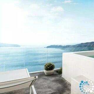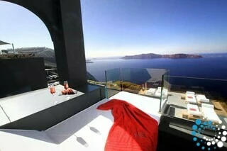 Here, the volcanic rock formations, the deep blues of the Aegean, the shifting tones of the caldera, the gentle sea breeze, and the warm Greek sun—from dawn to dusk—blend harmoniously with the natural surroundings.