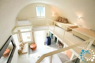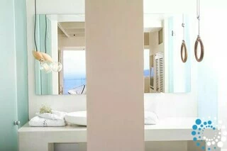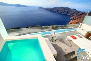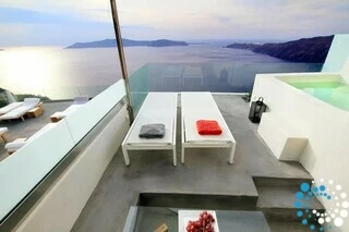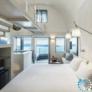 Suite Kauma boasts exceptional modern design and breathtaking views of the Aegean Sea overlooking Santorini’s iconic caldera and sunset. This suite offers the ultimate relaxation with an indoor or outdoor hot tub. Luxurious details like domed ceilings with attic bridges, illuminated showerheads, and sleek glass accents enhance the ambiance, while surprising elements of material and color create a truly unique atmosphere. Suite Kauma seamlessly blends contemporary elegance with the raw beauty of Santorini for an unforgettable stay.