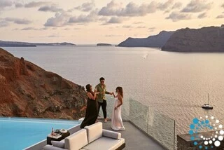 As evening falls and the island glows in golden hues, join us for a complimentary glass of sparkling wine paired with delicious finger foods—perfect for celebrating the magic of an Oia sunset in great company.