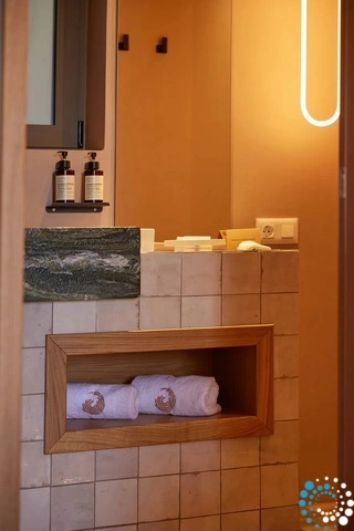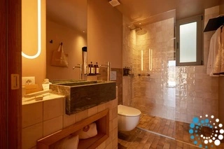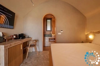 Enjoy the comfort of a king-size bed or find inspiration at the small workstation, all while surrounded by the mesmerizing beauty of Tinos’ landscape. Designed with meticulous attention to detail, the 27 m² suite exudes charm and elegance, offering a serene ambiance ideal for couples or parties of three.