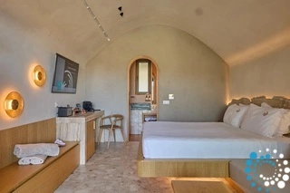 With an earthy, stylish interior and a bathroom featuring a rainfall shower, your relaxation is guaranteed. Wake up to the tantalizing aroma of a delicious Greek breakfast, soon to be served and of course included in your stay, before venturing out to explore the island. Take advantage of all Sun Aeriko’s modern amenities, such as a safe box, coffee machine, smart TV, open closet, and of course room and concierge services, ensuring an effortless and unforgettable experience in the Suite Riza.