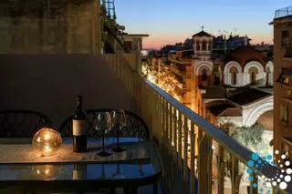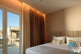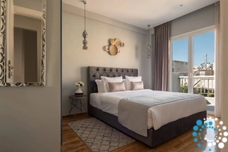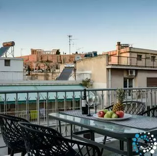Located on the fifth floor, the penthouse has a spacious veranda where natural light floods the interiors through floor-to-ceiling balcony doors. The terrace, adorned with plants and comfortable seating, offers tranquil views of the Acropolis—a perfect spot to relax and unwind. Lift access is available for convenience.