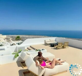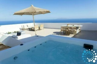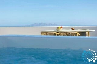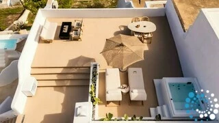 The suite blends traditional Cycladic charm with modern elegance, featuring soft pastel tones, natural wood details, and a relaxed boho-chic design that feels both inviting and refined. Outside, a heated jacuzzi provides the perfect spot to unwind while taking in the island’s sun-drenched beauty.