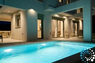 Each villa features a fully equipped kitchen, a dining area, and a spacious living room, complemented by three bedrooms and three bathrooms. Semi-outdoor spaces, a private garden, and an individual swimming pool complete the experience. Inside, natural wood, subtle textures, and olive-hued accents create timeless elegance, enhanced by the warm, radiant light of the Ionian coast.